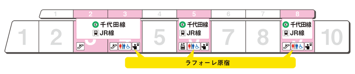 尚、エレベーター利用の場合は10両編成の場合は5両目、8両編成の場合は7両目‥に乗車しておくことで、降車したら近くにエレベーターがあることに…なっちゃぅ。