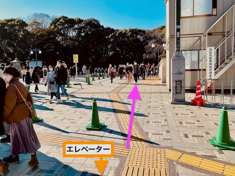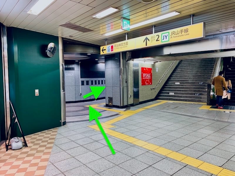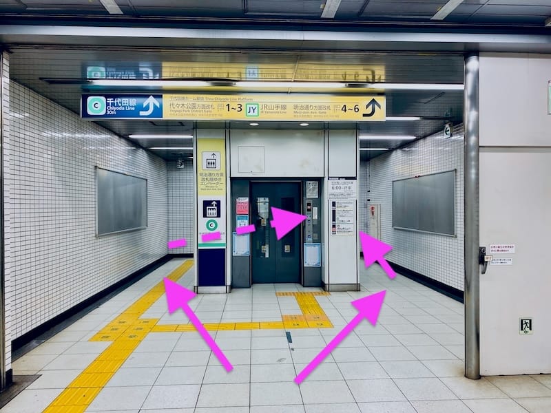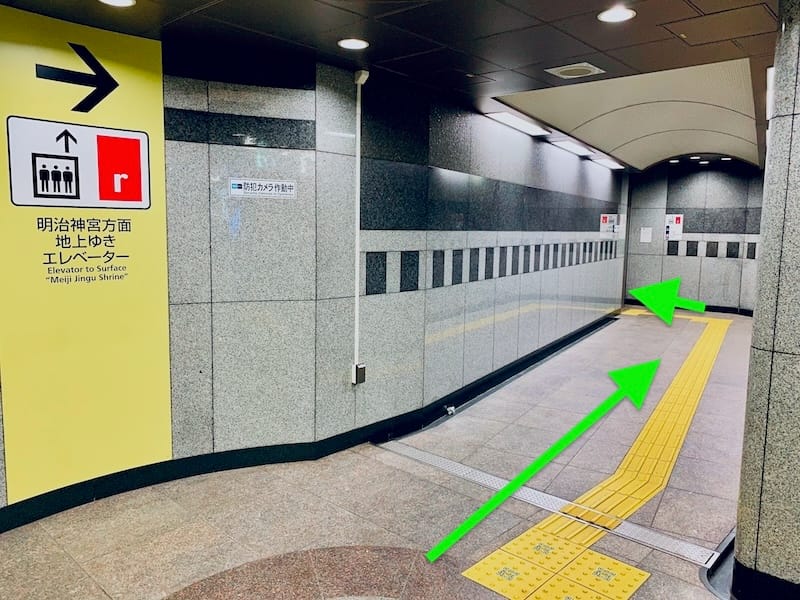 千代田線 明治神宮前駅地下の2番出口へ向かう階段を上がらずにエレベーターに搭乗して、1出口(エレベーター出口)を目指すルート