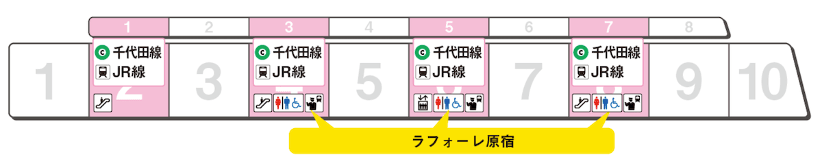 千代田線(改札口)へ通じる階段は、10両編成の場合、2両目4両目、それに8両目を降りた位置にあることが分かる。