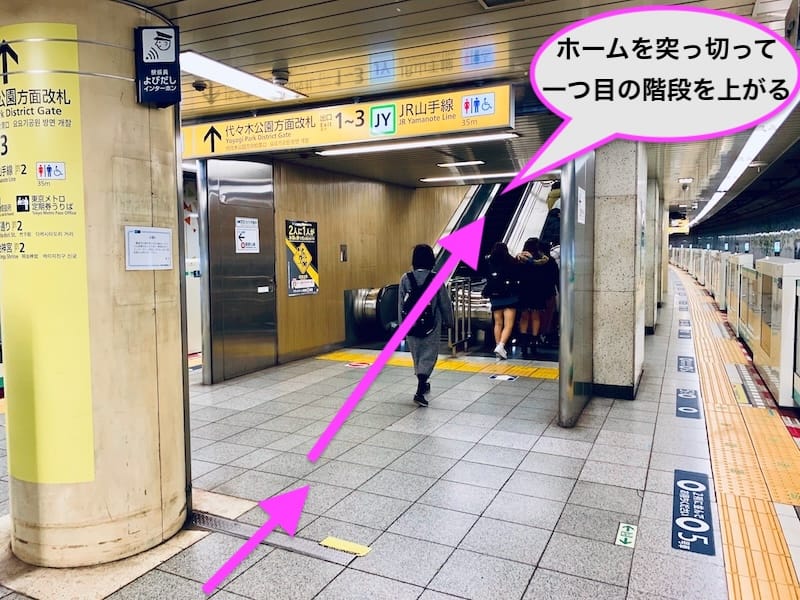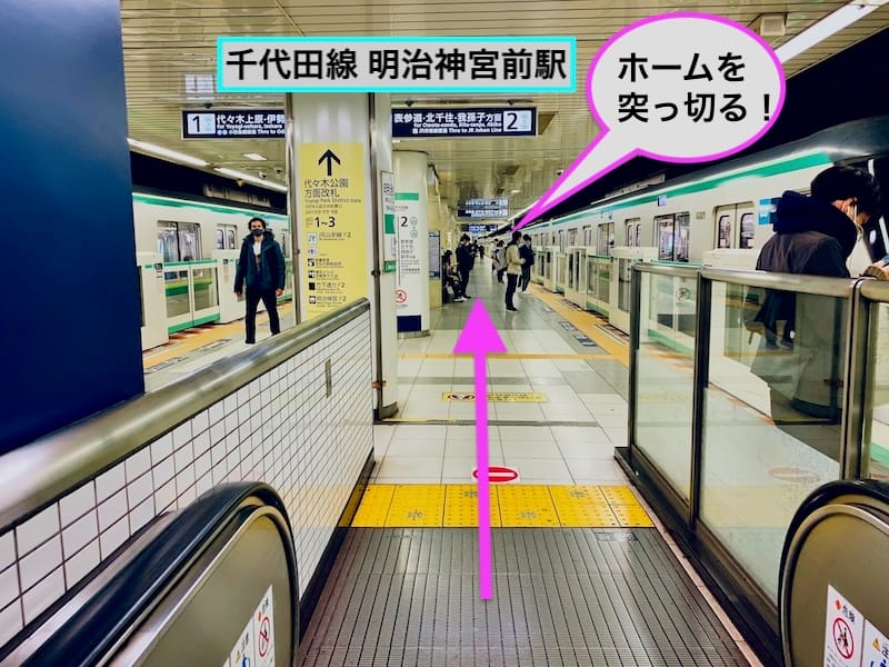 【明治神宮前駅から明治神宮(南参道/原宿口)までの移動ルート】副都心線ホームから千代田線ホームを経由して「1出口or2出口」へ